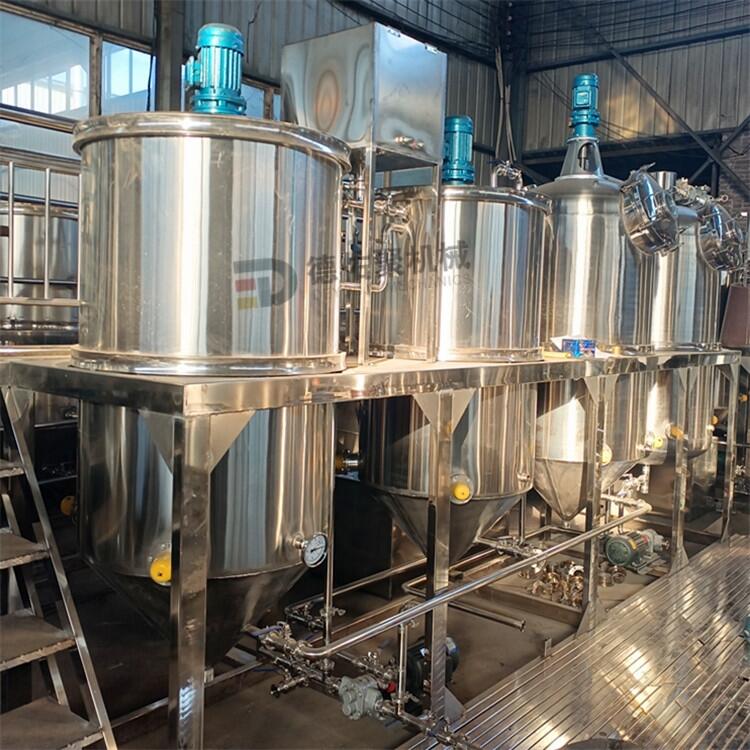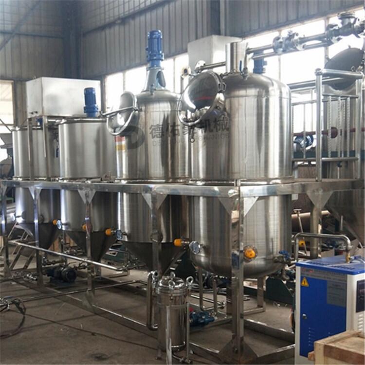 将原油泵入炼油罐进行脱胶和中和。当油和皂脚清晰分离时,迅速下沉,停止搅拌,静止,然后将上层油吸入洗涤槽。小型精炼油设备,皂脚由底部排空管放至皂脚桶,当皂脚含较多油时,停止放皂脚,皂脚由泵打入皂脚罐。炼油罐中剩余的油混入下一罐继续。小型精制油设备,转移至精制油罐的清洗油被水洗,到脱色罐进行吸附脱色。脱色油用泵送到板框过滤器过滤,再转入抛光过滤机进一步过滤,经过冷却器冷却后进入脱色清油灌。脱色后的清油从清油罐通过换热罐吸入除臭罐进行除臭。除臭在3-5托的残余压力下进行。脱臭油放入换热罐后,下一罐脱色清油通过换热罐吸入脱臭罐进行下一次脱臭。小型精制油设备的热交换槽的脱臭油进行热交换后,用冷水蒸发制冷,用泵抽出并研磨过滤,装入成品油槽。
