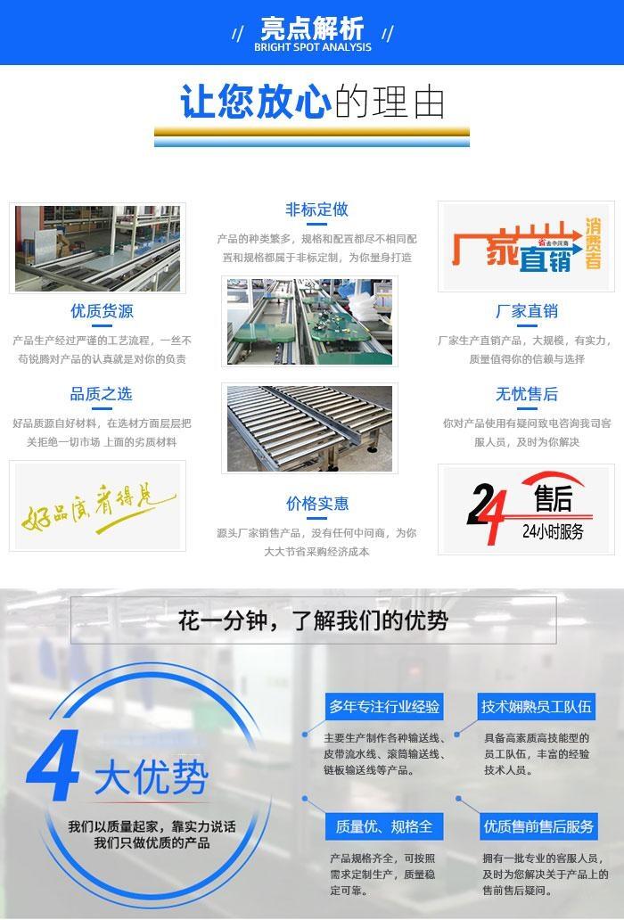滚筒式流水线特点:承载的产品类型广泛,所受限制少;与阻挡器配合使用,可以实现产品的连续、节拍运行以及积放的功能;采用顶升平移装置,可以实现产品的离线返修或检测而不影响整个流水线的运行。<br>流水线采用组合式装配模式,工位数可按工艺要求设定。工<br>优化流水线第1站的作业时间, 及多久放一片板子, 此为满足生产计划量所必须的投入cycle时间。江西输送机