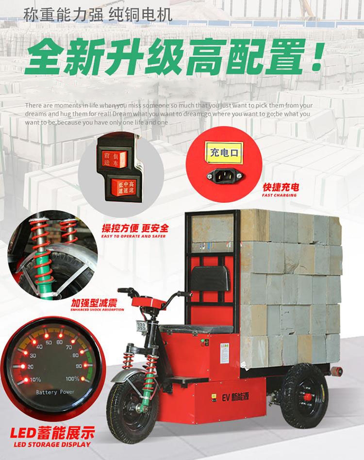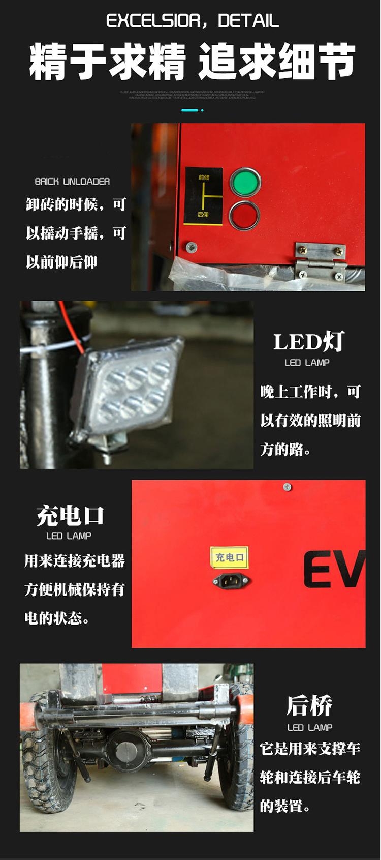 环保节能,日耗电不足10元。效率高,一机一人,轻松胜任各种砌块运输任务。绿色环保:该机全部利用电能驱动,无噪音、无振动、无油污、无二氧化碳排放。 小型电瓶拉砖车 自卸式拉砖车。