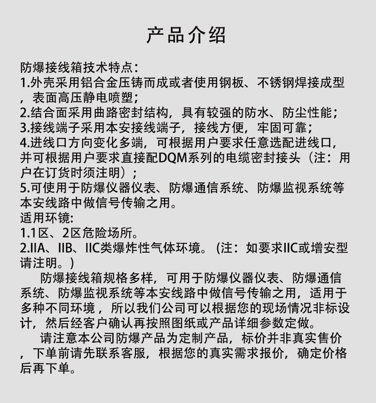 使用环境 | 石油采炼,储存,化工,医药,纺织,印染,军工及军事设施,加油站,天然气厂等爆炸性危险环境。 | ||