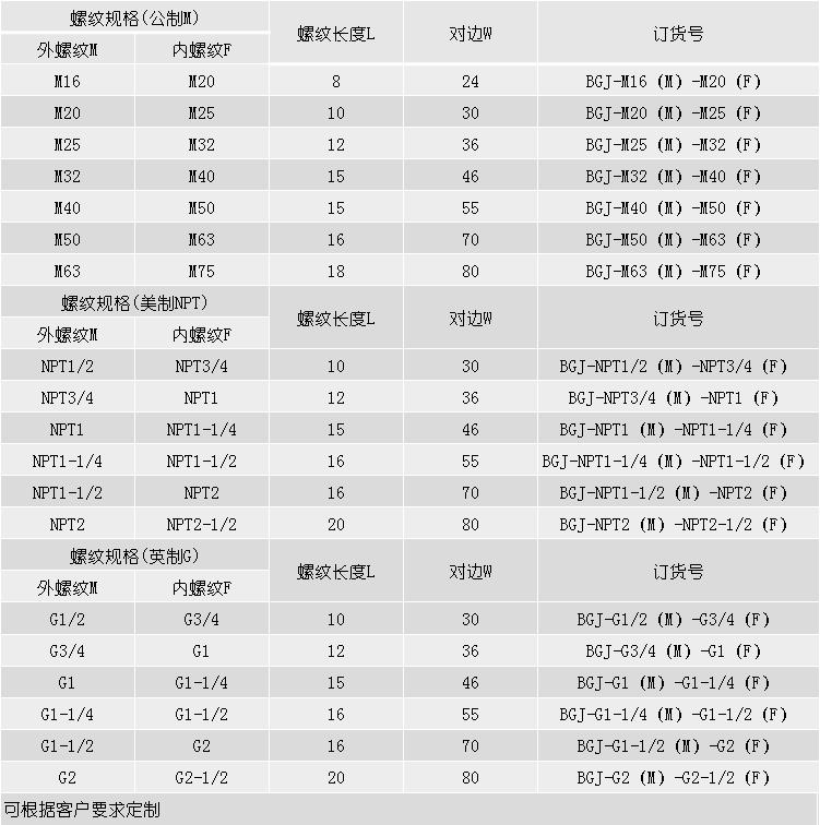 美制螺纹规格 | NPT1/2-NPT3/4、NPT3/4-NPT1 | ||