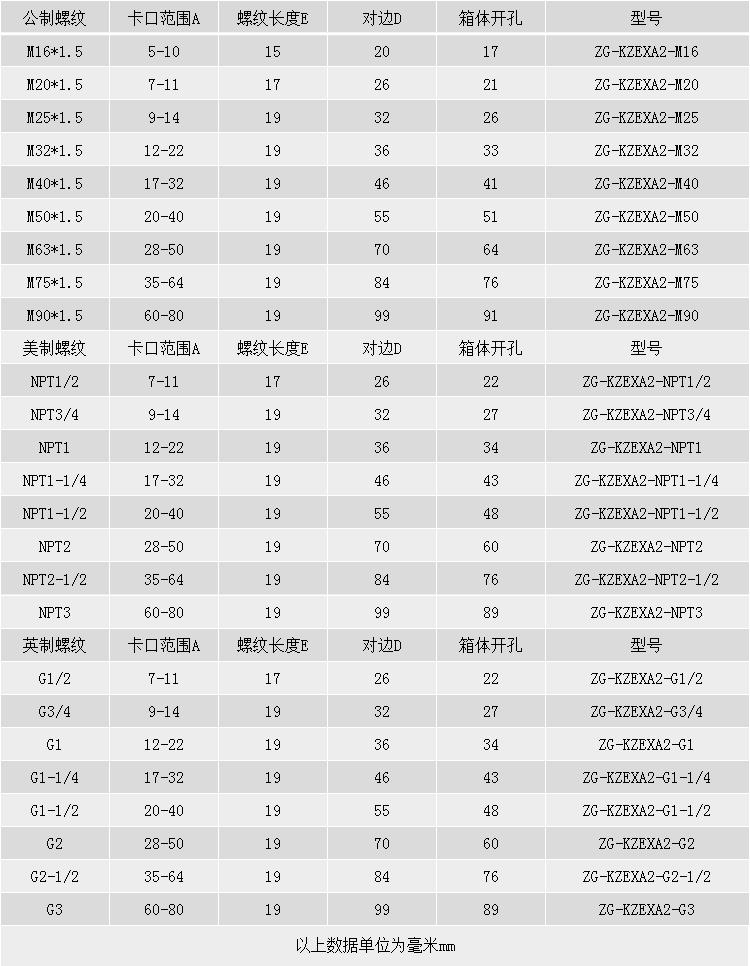 公制螺纹规格 | M16、M20、M25、M32、M40、M50、M63、M75、M90 | ||