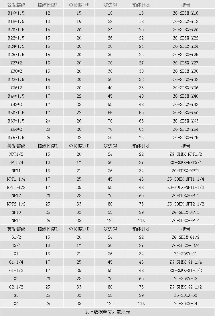公制螺纹规格 | M16、M20、M25、M32、M40、M50、M63 | ||