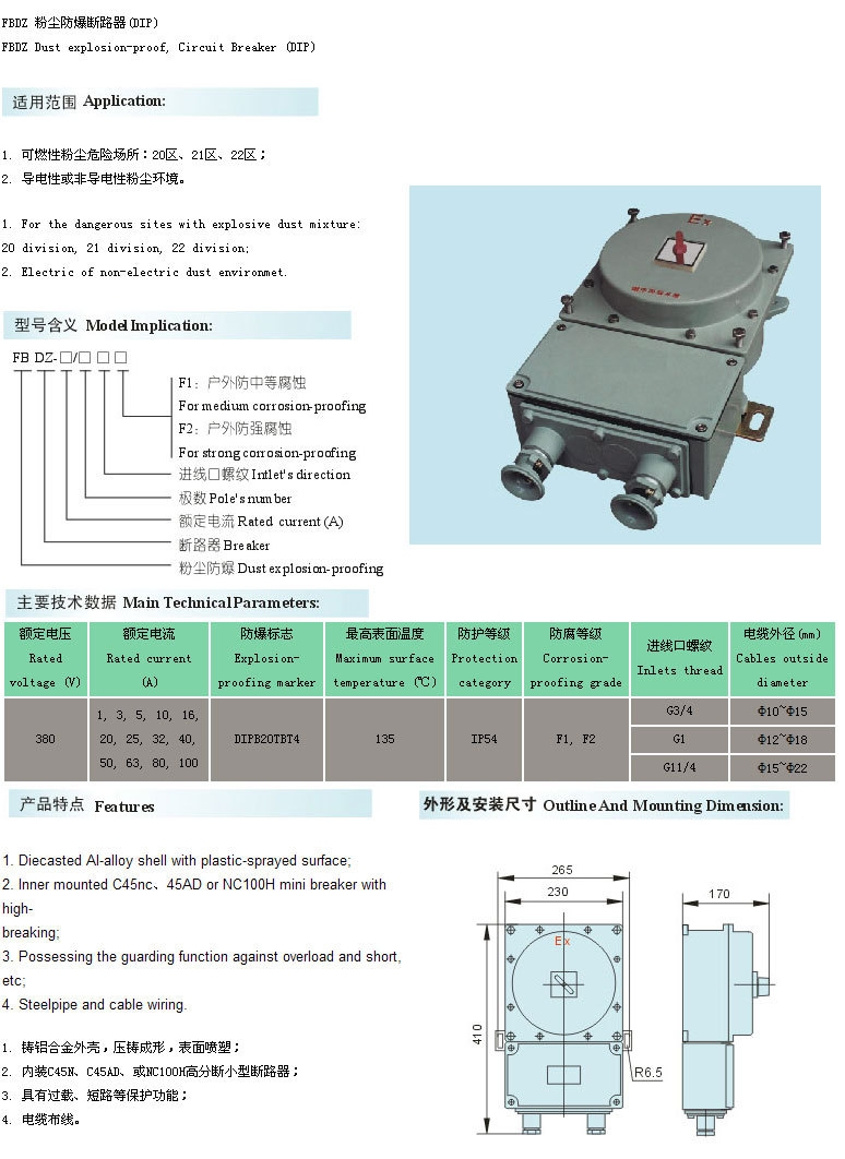防爆标志:ExdeIIBT4/T5/T6、ExdeIICT4/T5/T6、DIP A20 TA,T4/T5/T6;