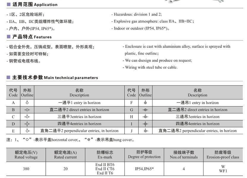 1 . 1 用途 AH 系列防爆接线盒(以下简称接线盒),适用于 T4 组及以下级别组别的含有爆炸性气体混合物的危险场所,用于交流 50Hz 、额定电压至 380V 、额定电流不超过 20A 的电路中接线、分线之用。