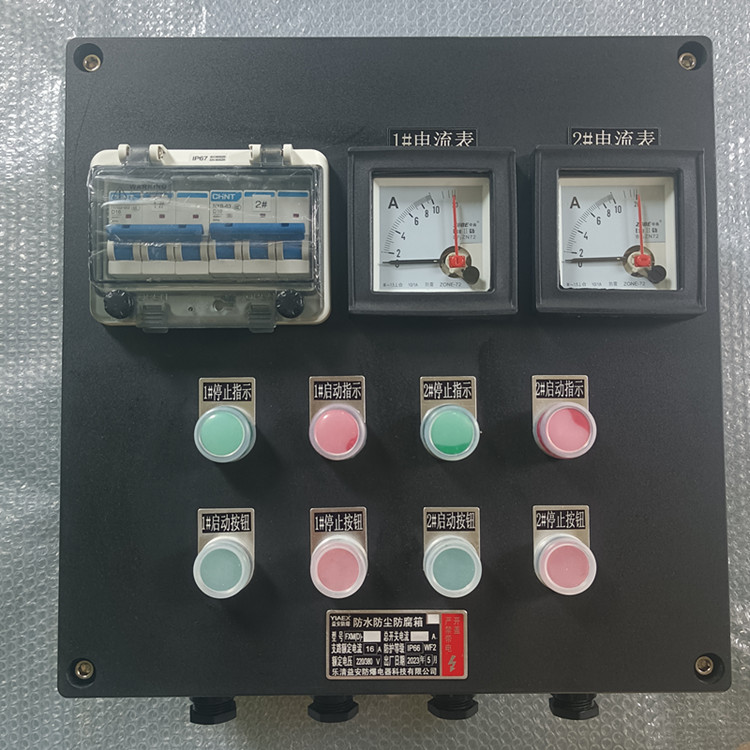 乐清益安防爆电器科技有限公司向您介绍我们的防爆机旁操作控制箱。我们将从多个角度来详细描述这个产品,帮助您了解它的特点和优势。下图这款防爆控制箱外壳尺寸为200X135X100,表面加装两个防爆按钮,两个防爆指示灯,一个防爆电位器,壁挂式安装,进出线口为G3/4,不锈钢紧固件。