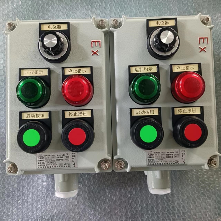 乐清益安防爆电器科技有限公司向您介绍我们的防爆机旁操作控制箱。我们将从多个角度来详细描述这个产品,帮助您了解它的特点和优势。下图这款防爆控制箱外壳尺寸为200X135X100,表面加装两个防爆按钮,两个防爆指示灯,一个防爆电位器,壁挂式安装,进出线口为G3/4,不锈钢紧固件。