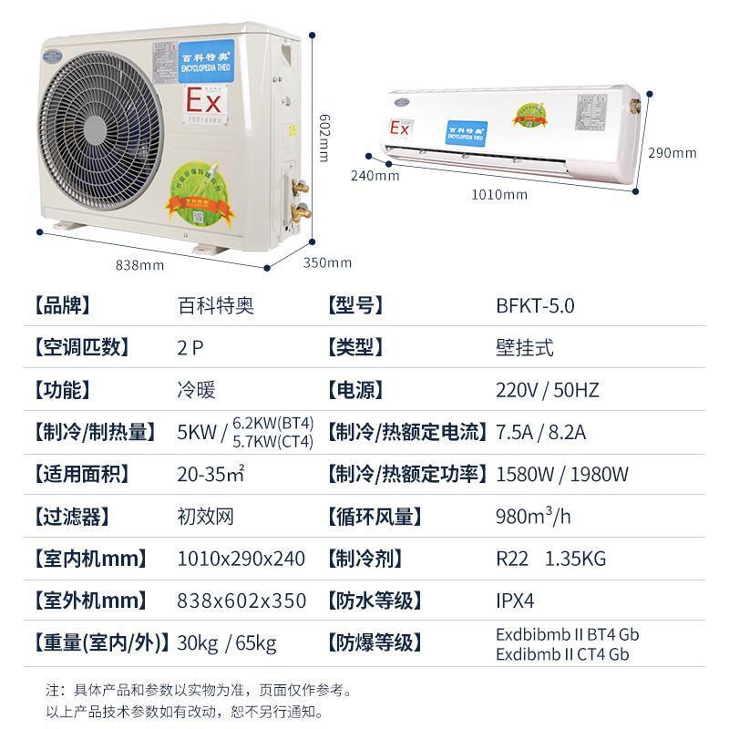 广州2匹防爆空调 广州防爆空调BFKT-5.0。以免在维修时造成错误判断而造成短路。检查之后如果效果还不好,可进一步测量电流和系统工作压力来判断。首先由监听表来测量空调的运行电流,如果电流小于标准电流,说明是管路系统缺少制冷剂,在加入制冷剂前,必须找出缺少制冷剂的原因。如果检测的运行电流明显偏大,需进一步测量系统的运行压力来判断故障部位。假如压力偏小,说明系统有轻微堵塞的地方。加入压力偏大,会认为外籍散热不好或者充入制冷剂过多。如果测得的空调运行电流正常,还可通过测量系统压力进行判断。如果压力偏小,说明洗头呢微赌。如果压力正常,可以进一步观察动作来进行故障划分。