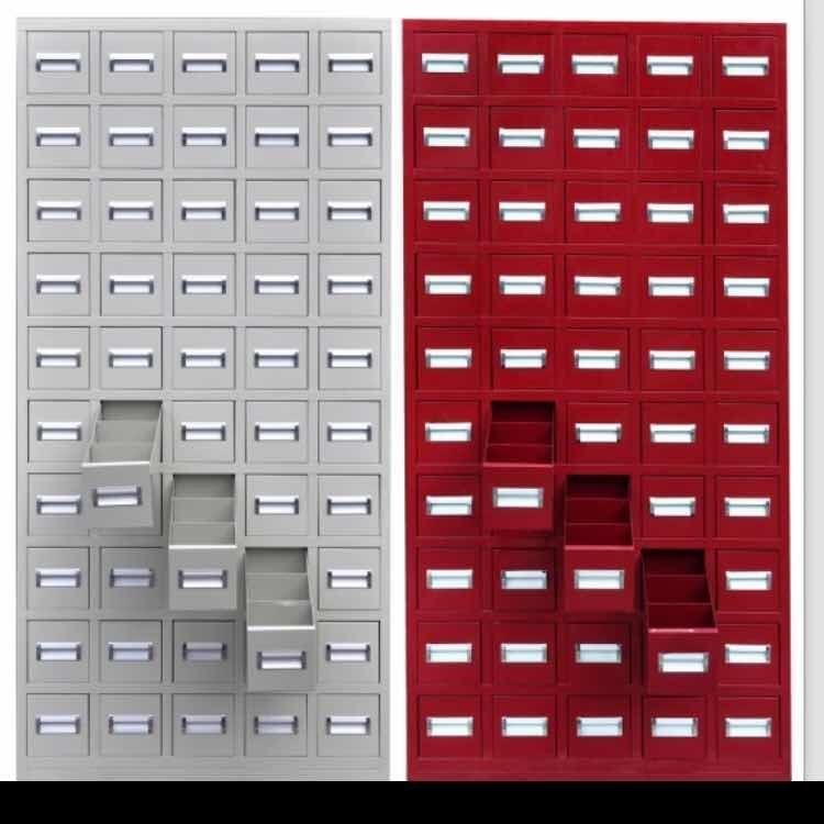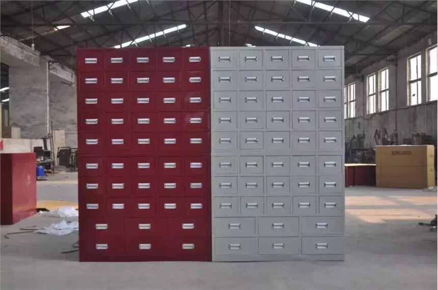 钢制中药柜柜体采用0.6MM的优质冷轧钢板,经剪切,冲压,折弯,焊接,装配而成,柜体表面静电粉末喷涂,防锈,放腐,无异味,对人体无害,且表面光滑易清洁。抽斗内部采用自制平滑导轨,不易卡死,推拉自如;扣手采用铝合金扣手,于柜体处于同一平面,美观大方。有亚光白色和酒红色,