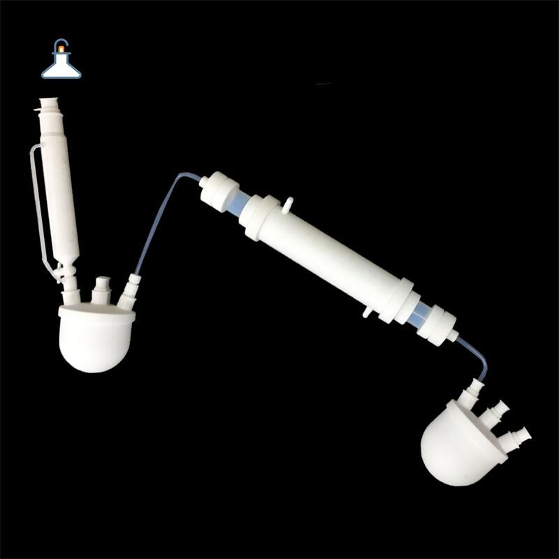 四氟烧瓶也叫聚四氟乙烯反应瓶、圆底烧瓶、三颈烧瓶等,通常具有圆肚细颈的外观,与烧杯明显地不同。它的窄口是用来防止溶液溅出或是减少溶液的蒸发,并可配合橡皮塞的使用,来连接其它的聚四氟乙烯器材。当溶液需要长时间的反应或是加热回流时,一般都会选择使用聚四氟乙烯烧瓶作为容器。烧瓶的开口没有像烧杯般的突出缺口,倾倒溶液时更易沿外壁流下,所以通常都会用四氟搅拌棒轻触瓶口以防止溶液沿外壁流下。烧瓶因瓶口很窄,不适用四氟搅拌棒搅拌,若需要搅拌时,可以手握瓶口微转手腕即可顺利搅拌均匀。若加热回流时,则可於瓶内放入磁搅拌子,以加热搅拌器加以搅拌。烧瓶随著其外观的不同可分平底烧瓶和圆底烧瓶两种。