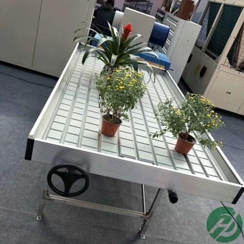 ? ? ?单体苗床框架是由边框、横撑、8滑轮组成,边框横撑及滑轮支架,采用经过氧化处理的铝合金整体焊接而成,滑轮由轴承及尼龙轮组装,网片式苗床采用75x25x3mm的镀锌网长度是5.73m,宽度是1.78m,表面是经过热镀锌防腐处理,潮汐式苗床采用抗紫外线耐老化和抗化学性的高抗冲击,性聚苯乙烯材料而成。轨道部分有轨道及轨道立柱组成轨道间距3.2米,立柱是由?圆管底盘调节螺栓组成,轨道高约0.52米,圆管及底板焊后热镀锌处理,纵向间距1.75米。纵向转移装置为铝合金纵梁横撑、竖腿、尼龙滚轮、升降气缸气动阀及焊接镀锌支架组成。? ? ? ? ? ? ? ? ? ? ? ? ? ? ? ??