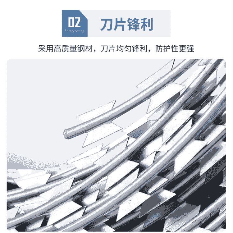 工艺:刀片刺网由热镀锌钢板或不锈钢薄板冲压出尖锐的刀片状,高张力镀锌钢丝或者不锈钢丝做芯线组合而成的阻绝器材。由于刺网造形 不易触摸,因而能达到 的防护隔离效果。