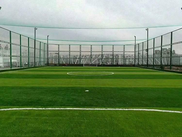 足球场围网表面处理:围网采用PE/PVC包塑丝,立柱、边框采用喷塑、浸塑处理