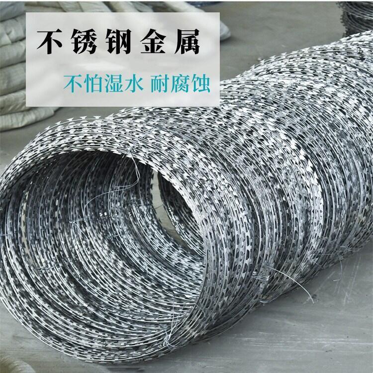 刀片铁丝网,上、下部悬挂0.5米的交叉蛇腹型刀片刺网,刀片刺网采用钢板冲压成型包附于钢丝(筋丝)之上,由锐利尖角镀锌钢板或不锈钢薄板做刀片,高张力钢丝做芯线组合而成的。锋利的刀型刺由双线扣装后成蛇腹状,既美观又让人不寒而粟。起到了很好的阻吓作用。