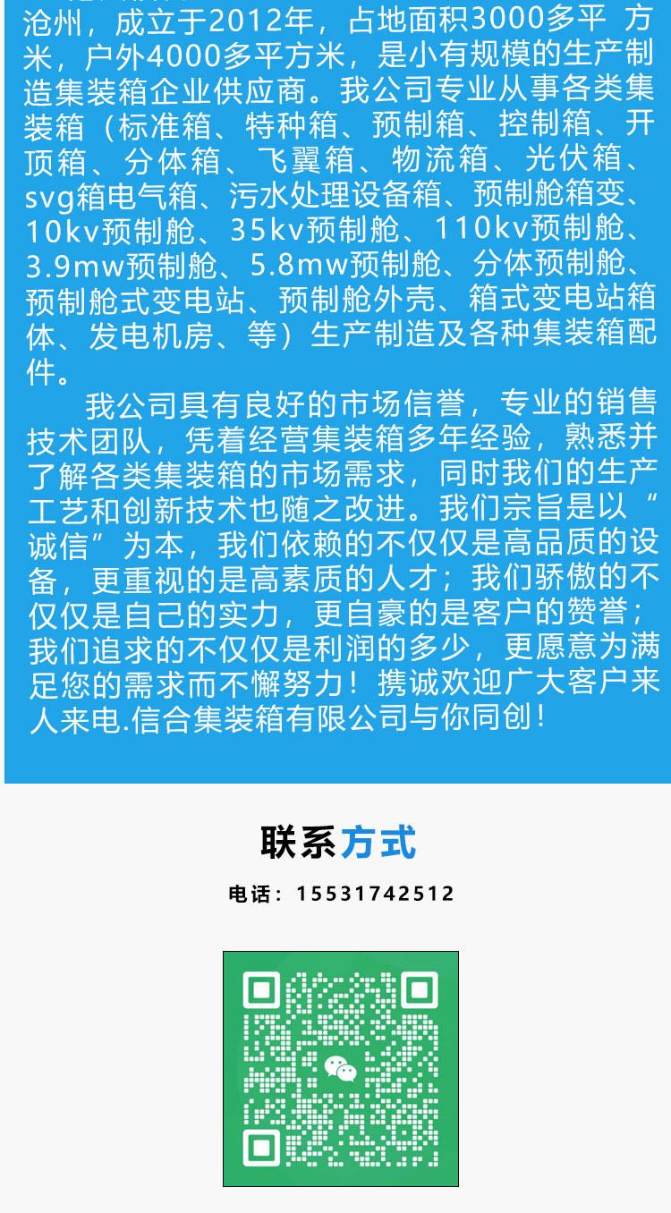 产品种类 | 电力设备集装箱、光伏储能集装箱、污水处理集装箱、移动数据中心、空压机集装箱 | ||