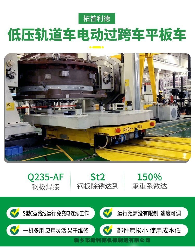 KPDZ系列平车的驱动系统是有直流电机、减速机、车轮组成的,直流电机的电流是从轨道上引入的,轨道上带36V的两相交流电,轨道上的电流是380V的交流电通过降压变压器降压后得到的,该系列平车需要一套取电装置从轨道上取电,引入电器箱后,通过电器控制系统控制平车的前进、后退和停止。