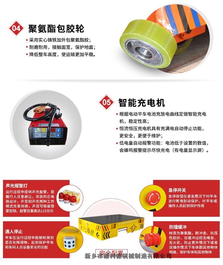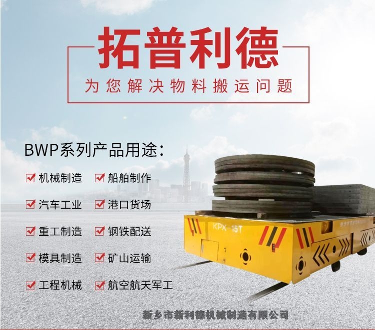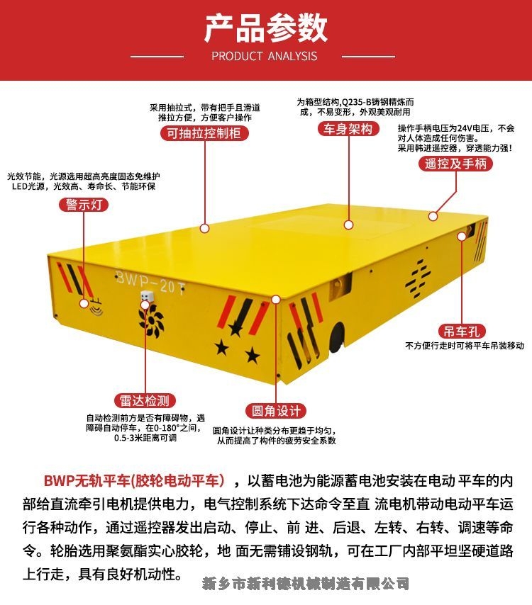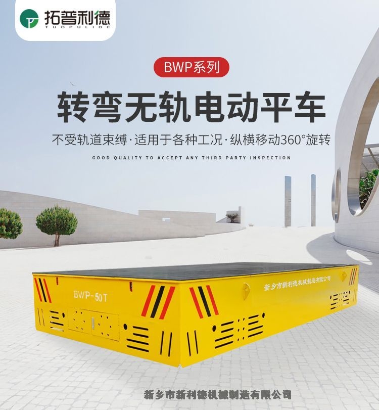 BWP无轨平车(胶轮电动平车)以蓄电池为能源,电动转向,电机经减速机驱动橡胶轮运行,地面无需铺设钢轨,可在工厂内部平坦坚硬道路上行走,具有良好机动性.轮胎选用聚氨酯实心胶轮. 蓄电池采用牵引用蓄电池,电机为工业牵引直流电机.进口无级调速控制器 标配无线遥控和线控两种控制方式.无轨车的动力源来自于车体内部的铅酸蓄电池组,通过车载控制箱来控制电机给传动系统提供动力,带动整台车启动和停止。操作方式通常为随车手柄和无线遥控。
