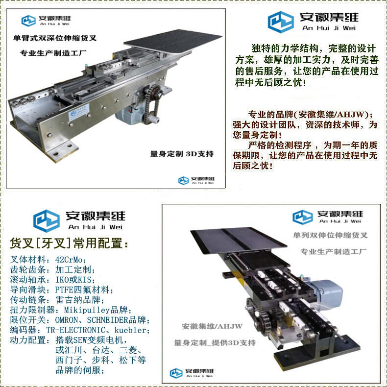 单指式也称单列式,单指式伸缩牙叉是由单组叉臂独立运行的,主要用于体积比较小、重量比较轻的物料移载,而双指式也称双列式,它是由两组叉臂组合运行的,双指式伸缩牙叉适用于体积比较大的物料移载!