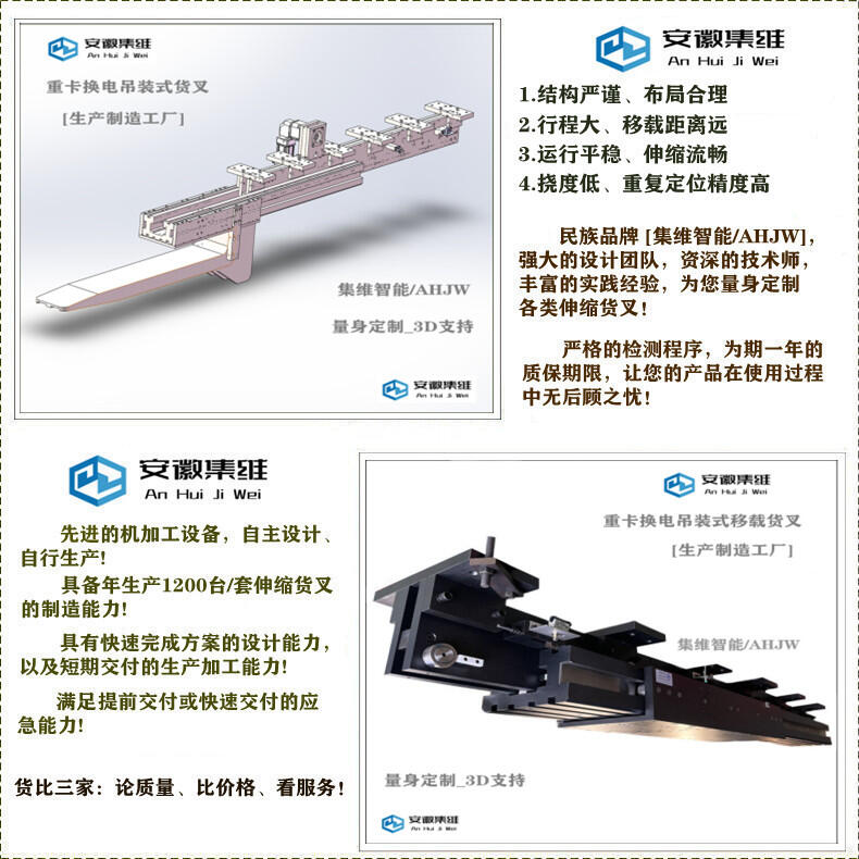 安徽集维智能装备有限公司[马鞍山市]是一家集研发、生产、销售为一体的自动伸缩移载货叉生产制造厂家,拥有完整的质量管理体系,雄厚的加工实力,丰富的生产设计经验,先进的机加工设备,自主设计、自行生产,具备年生产1200台套移载货叉的制造能力,具有快速完成方案的设计能力,以及短期交付的生产加工能力,具备提前交付或快速交付的应急能力,备有众多的成功案例为您提供参考!