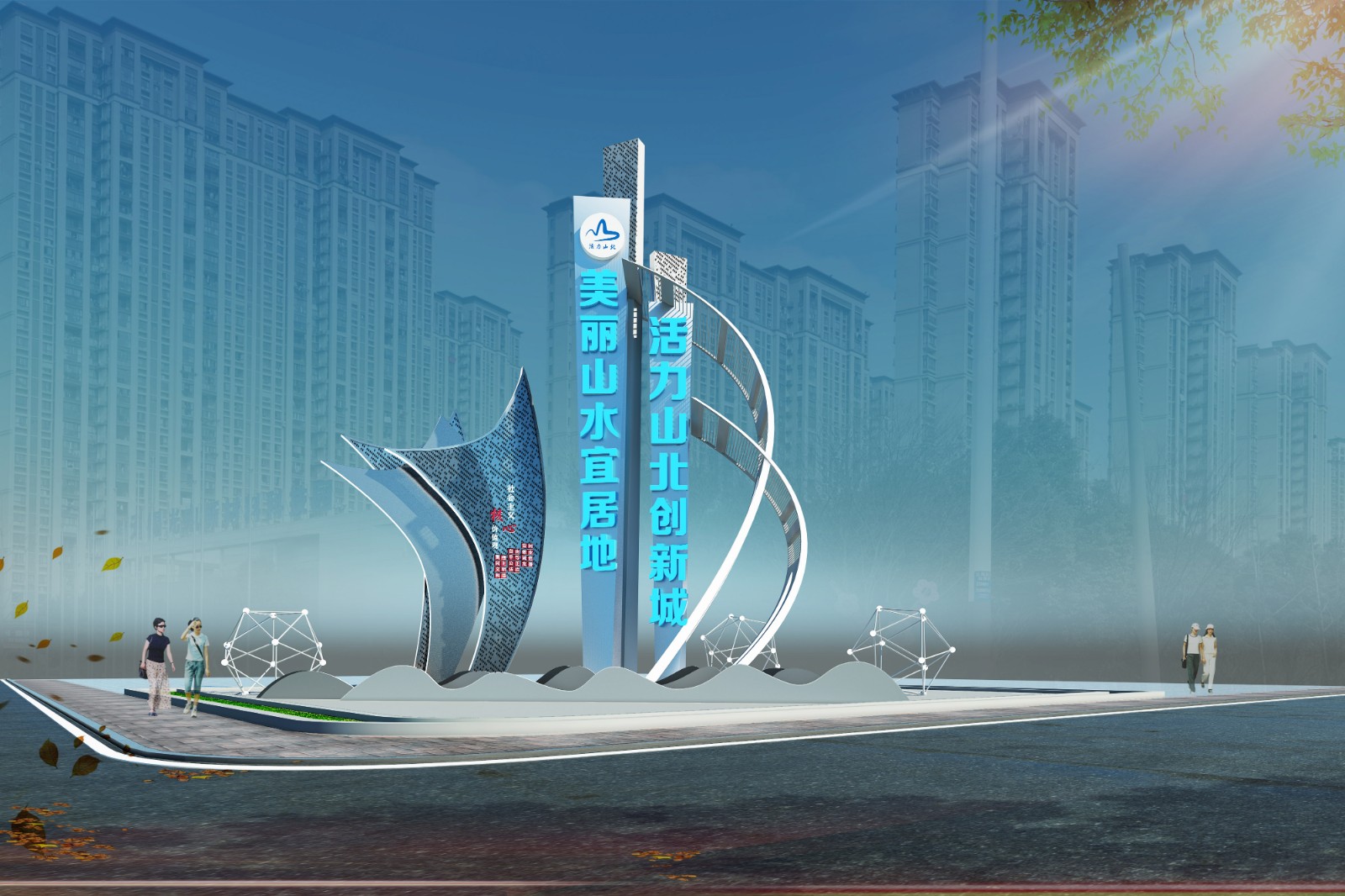 美丽山水宜居地,活力山北创新城。雕塑由浓缩的发展中的城市缩影和抽象的山水造型组合而成