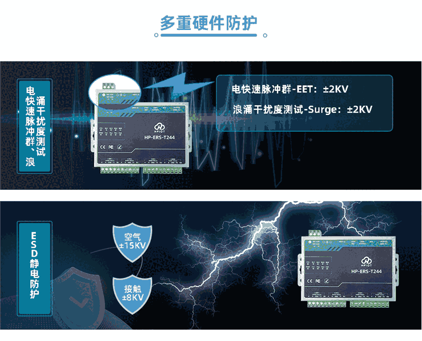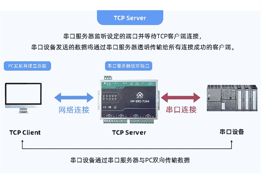 HP-ERS-T244四串口服务器用于实现串口到以太网口的数据的双向透明传输。用户无需关心具体细节,服务器内部完成协议转换。串口一侧实现串口数据的透明传输,以太网口一侧则是TCP/IP数据包,通过简单设置即可**工作细节,四个串口相互独立。可以通过服务器内部的网页进行,也可以通过设置软件进行设置,一次设置永久保存。采用Cortex-M7方案,主频高达400MHz,性能更强,传输速度更快,可靠性更高。搭载深度优化的TCP/IP协议栈。双重看门狗和多种保活机制助力设备稳定运行。支持TCP Client、TCP Server、UDP Client、UDP Server、Httpd Client五种工作模式,简单配置即可实现数据透传功能。