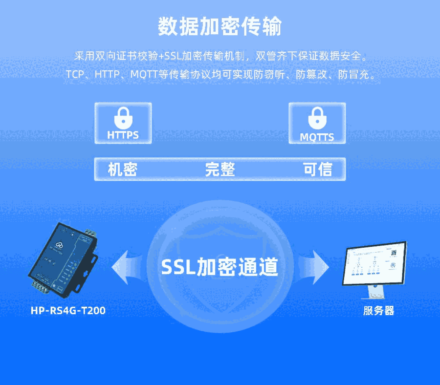 采用工业级设计标准,内置独立硬件看门狗,RS485完全独立电器隔离,支持多路SOCKET,同时可连接四个服务器,支持自定义心跳包/SN心跳包/1CCID心跳包/ME心跳包,支持自定义注册包/SN注册包/ICCID注册包/IMEI注册包。