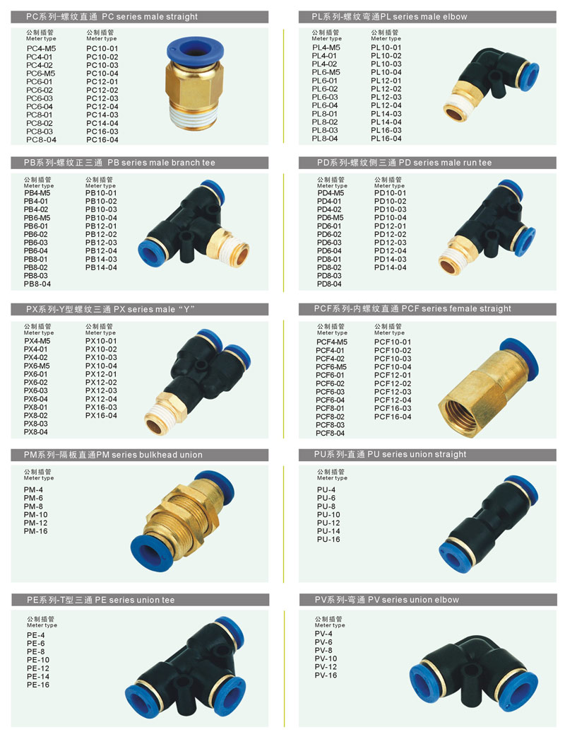 主要用于空气配管、气动工具配件。对应其用途,有丰富多样的本体材质、尺寸及安装形状多样。