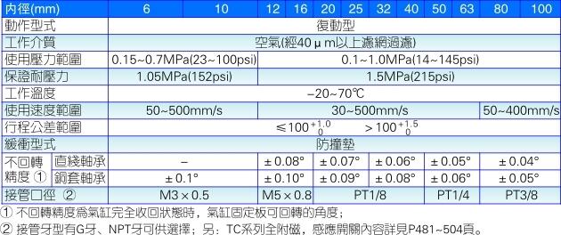 注:钢珠直线轴:适用于气缸作推举动作,或要求高精度各高承载能力的场合,特别适用于要求低磨擦运动的场合; 青铜滑动轴承:适用于气缸作制动等耐径向负荷动作的场合,较一般之制动缸相较提升两倍以上的耐横向冲击力,且具有更大的扭转刚度。 |