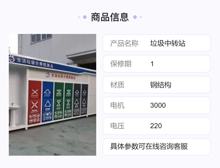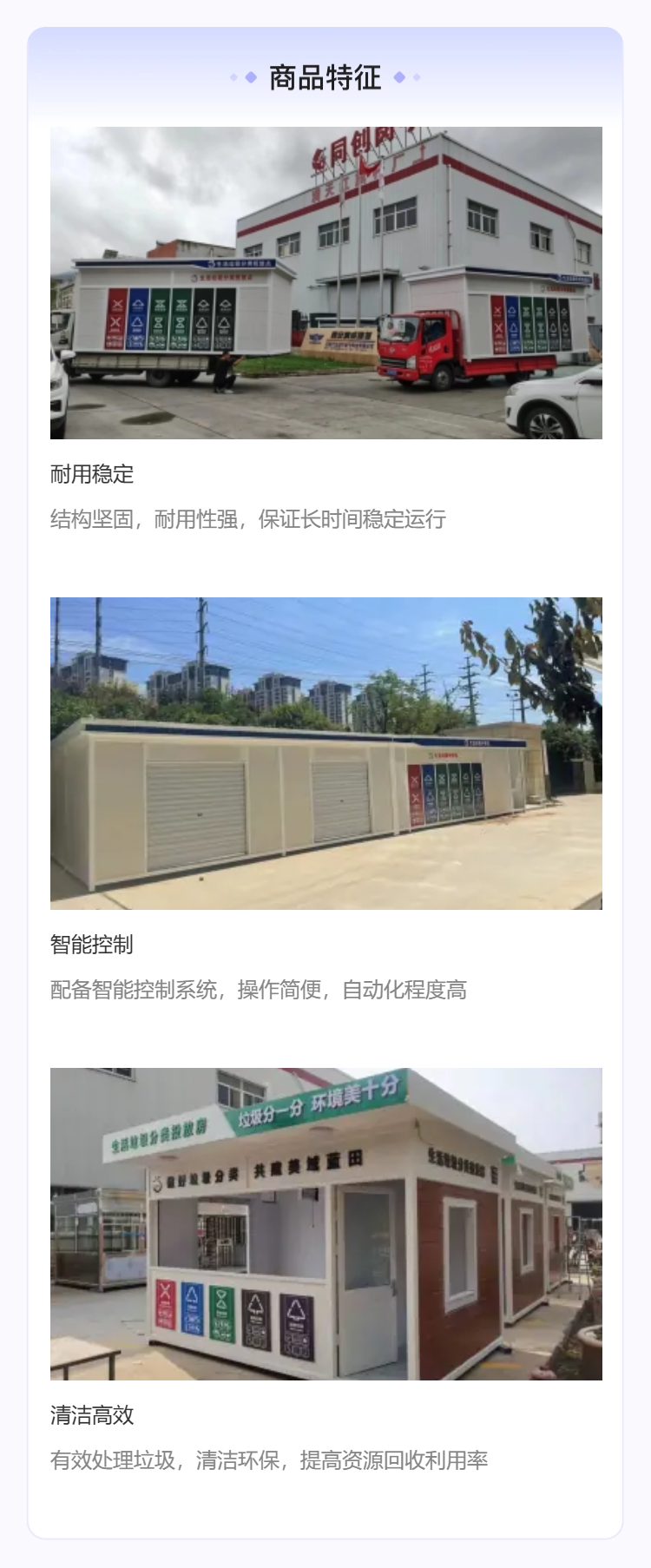 用途范围 | 小区垃圾分类房 户外环保收集站 可回收智能干湿分离 清洁屋 | ||