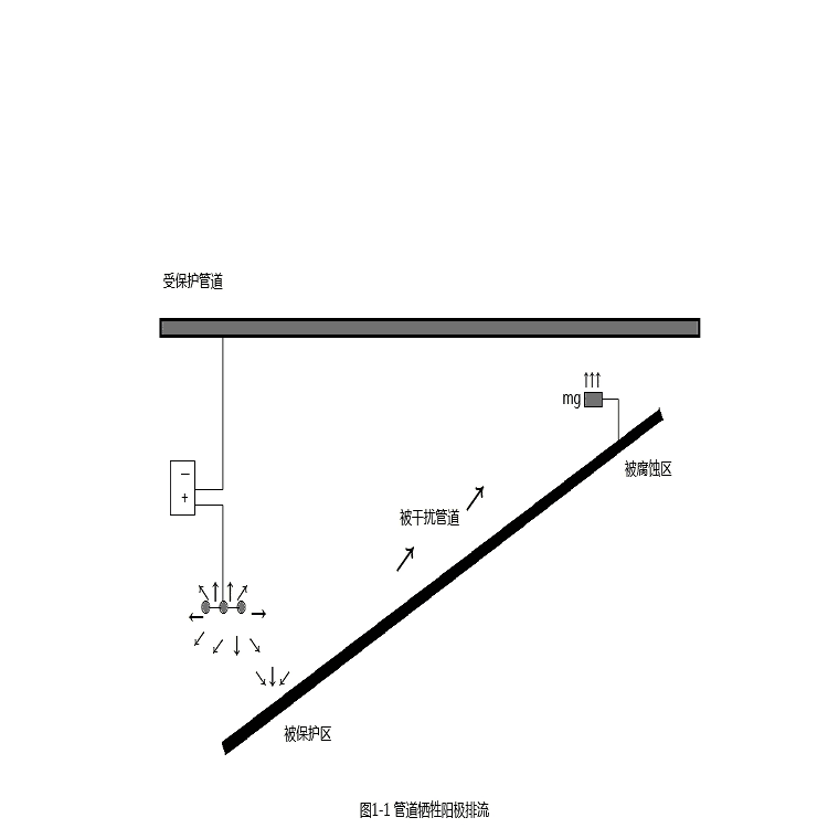 在受干扰管道电流流出段安装牺牲阳极,如图1-1所示,使被干扰管道的杂散电流沿牺牲阳极流出,而不是通过管体本身流出。由于镁阳极的电位较负,所以,通常安装镁阳极。镁阳极要靠近产生干扰的管道(受保护管道)安装,以降低杂散电流排放回路中的电阻。必要时,可以在管道交叉处,在产生干扰的管道与被干扰管道之间安装接地电池以减小两个结构之间的电阻,便于杂散电流的排放。