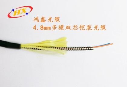 鸿鑫光缆产品:单模双芯铠装光缆是将两根紧套光纤表面缠绕一层扁平不锈钢丝进行铠装,在铠装层内施放多股芳纶(凯孚拉),再挤制阻燃外套。