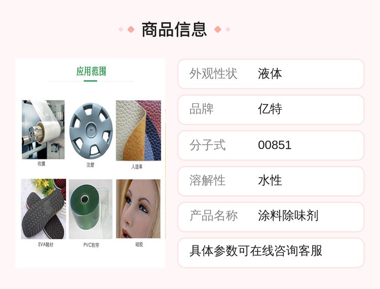 用途范围 | 水性涂料、油漆、油墨等产品除味 | ||