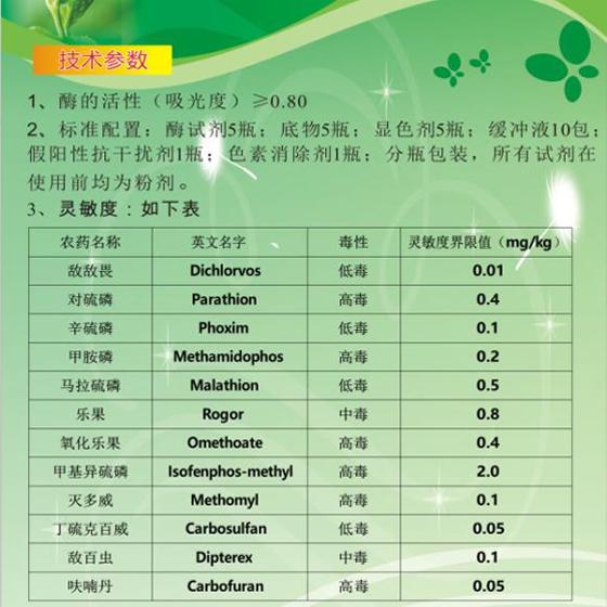 【产品用途】 适用于蔬菜中有机磷和氨基甲酸酯类农药残留的检测。