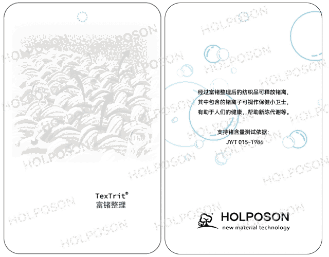 富锗整理剂HOLPOSON® GE是本公司采用微胶囊技术制成的功能型整理剂,后整理高温定型能使富锗整理剂HOLPOSON® GE牢固的结合在纺织品上,使其具有持久的释放功能。
