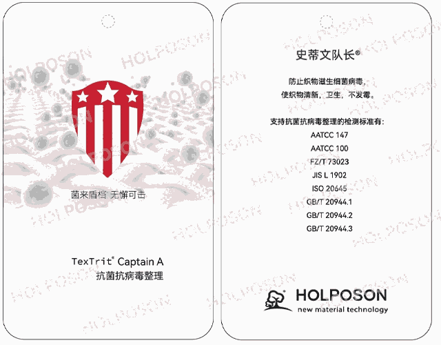 抗菌抗病毒整理剂HOLPOSON®CAPTAIN A具有耐洗的抗菌抗病毒材料,能有效抑制大肠杆菌、白色念珠菌、流感病毒H1N1,H3N2等,作用原理是阻止细菌病毒核酸合成,破坏微生物的代谢过程,终止其生长、活动和繁殖的能力。符合以下抗菌标准检测:ISO 20743-2007,AATCC 100-2004,JIS L1902-2008,GB/T20944.1-2007,抗病毒检测标准:ISO 18184 2014(E),主要应用于:家纺、服装、车内饰面料、医用防护等。