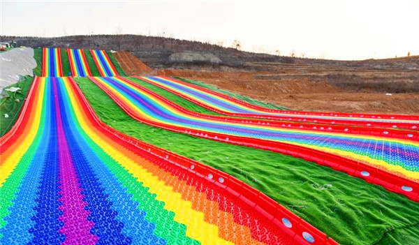 彩虹滑道长度是可以定制的,长度达到100至150米,还有长达260米的。这么一条长长的彩虹滑道铺在那里,何等的壮观宏伟,远远的就可以吸引住人们。而且彩虹滑道玩法惊险,让游客们在游玩的过程中体验到旋转感、倒滑感、失控感、碰撞感等。另外彩虹滑道是和雪圈搭配使用的,姐妹组、兄弟连、全家福等玩法都可以得以实现。让人们更有参与感和互动感。