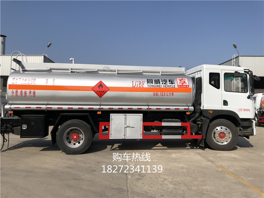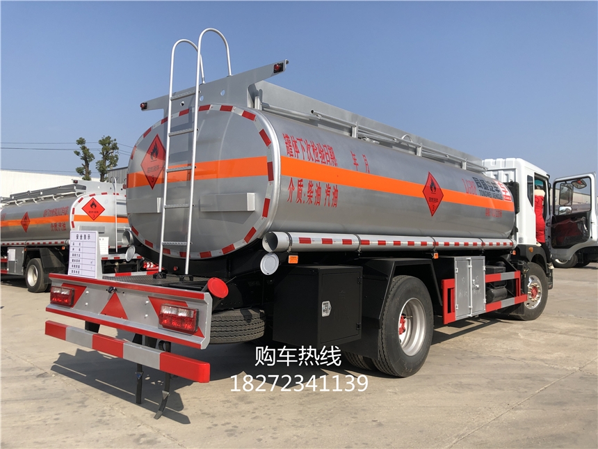当然一台期间配置的大卡车,工具箱是少不了的,还有铝合金折叠护栏,罐尾一部爬梯,罐体两周分别贴一张反光板,一个防火帽,两根与罐体长度相当长的输油管,两个灭火器更是神助攻,罐体涂有防锈漆,一般用个3-5年不会生锈的,贴有3M国际大牌反光条,反光带,还有安全告示,三个依然液体标,让您上路更加的安全。