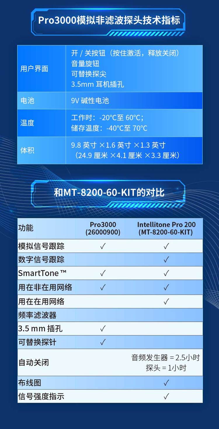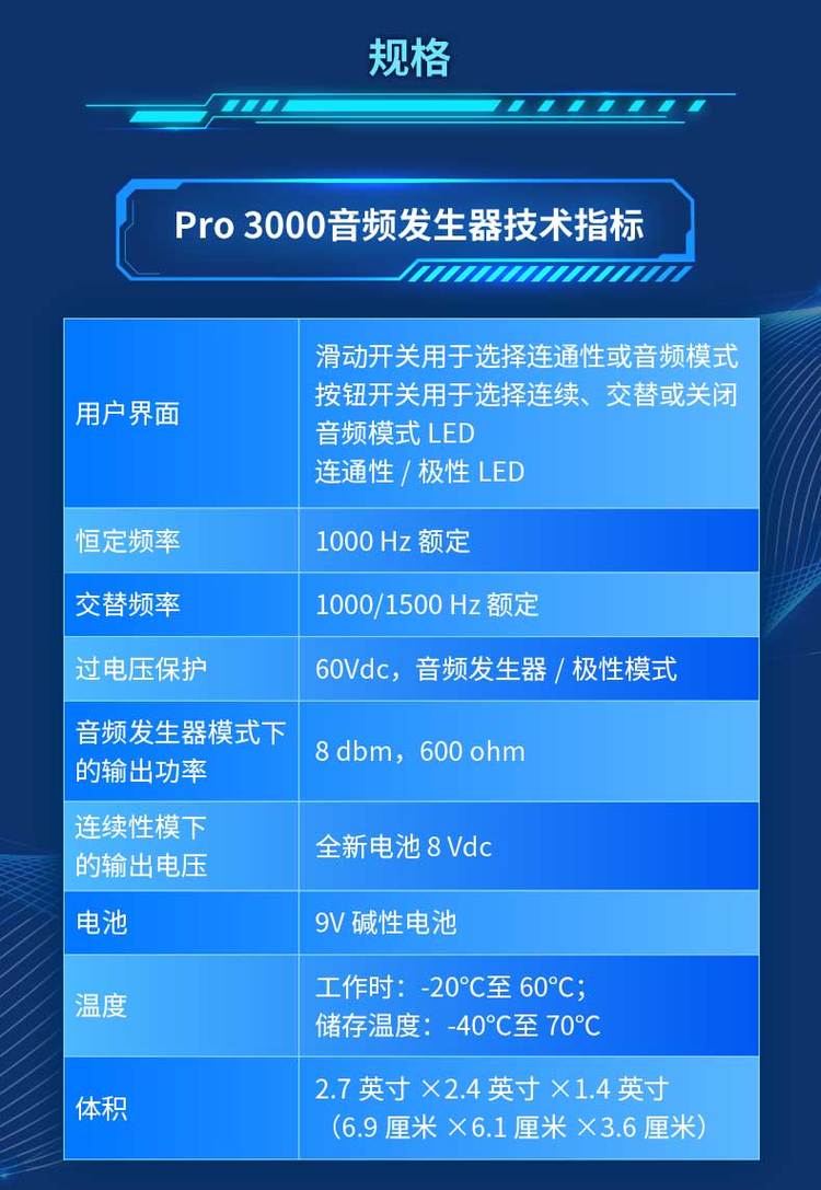 使用 Pro3000 模拟音频发生器的 SmartTone 功能可以识别正确的线对。将电线接触到一起并且立即缩短线对的远端时,SmartTone 技术将改变产生的音频的节奏。您通过探头听到的音频变化可以有效验证线对是否正确。SmartTone 技术可提供五个 的音频用于准确的线对识别。