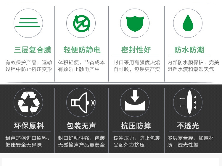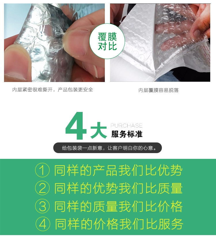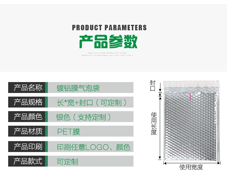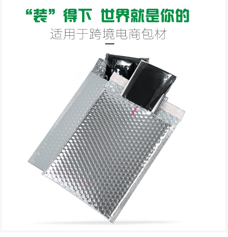 专业生产镀铝膜气泡袋。外层为镀铝膜(多种顏色),表面光滑平整,可在不侵犯他人知识产权的情况下,根据客户要求印刷不同图案、商标及文字;内衬气泡膜,具缓冲防震作用,防止物品因压,碰,跌落而损坏;袋子美观大方,外层镀铝膜颜色可根据客户要求定制;信封口自粘条设计,安全便捷;推荐使用范围:邮寄光盘碟片、磁带、电子元件、集成电路板、光学镜头、书籍、相 框、礼 品、钟表…等物品。