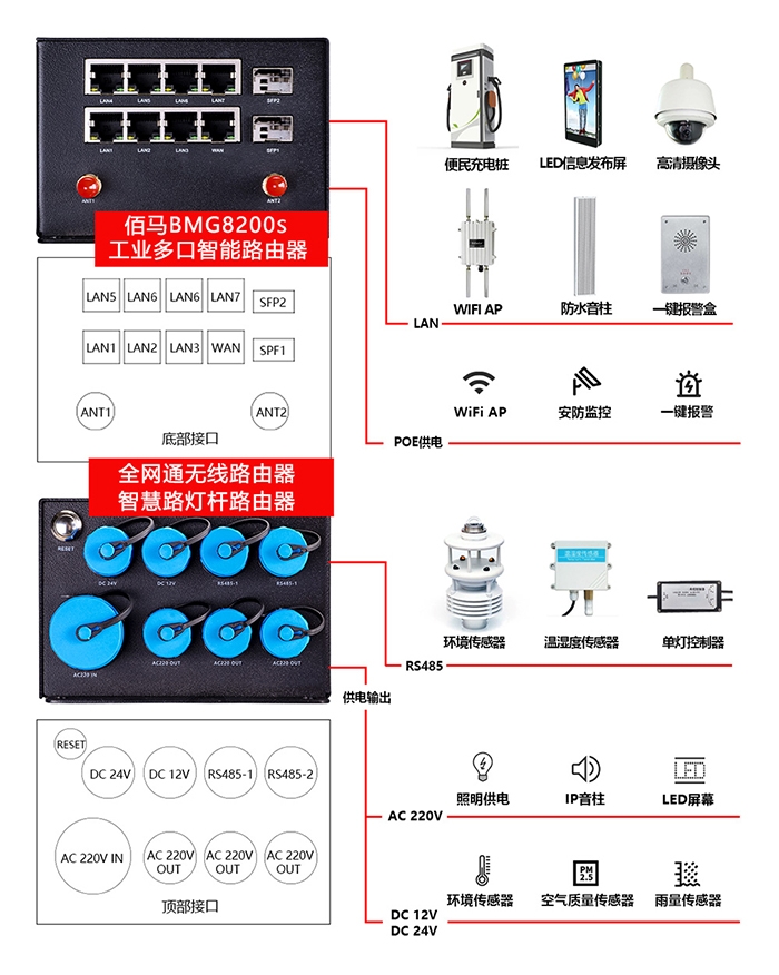 例如智慧路灯杆应用,佰马BMG8200s工业级全网通智能路由器,支持照明灯头、监控探头、环境传感器、LED信息屏、广播喇叭、充电板/充电桩,微基站等设备的一站式接入,数据信息还可向12个中心分发传输,让各主管部门协同配合,共建智慧城市。