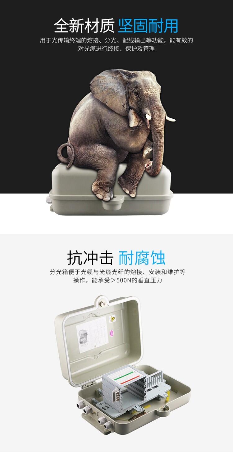 4、光缆分纤箱具有光缆引入、固定和保护装置,可保护光缆及缆中纤芯不受损伤,并实现光缆的熔接与分纤。
