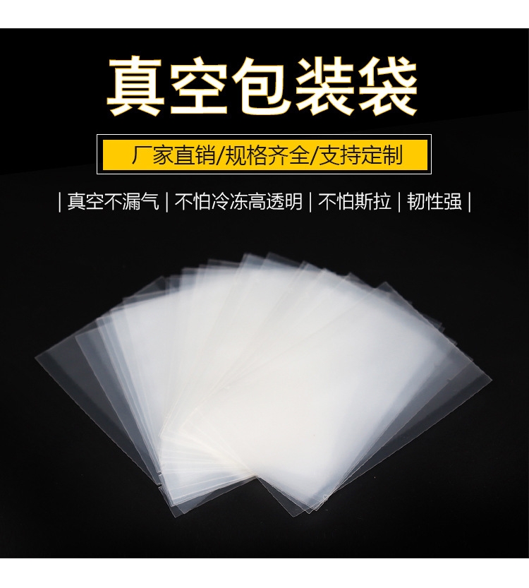 1. 特级真空包装袋,选用材料经过QS认证符合食品标准,做工精细,封口边缘平整,厚度一致,透明度高,每批真空袋出厂经过车间技术部门的严格检验后出厂。