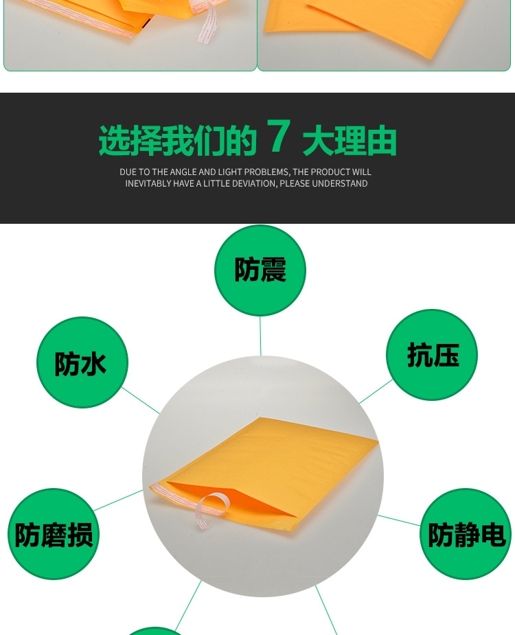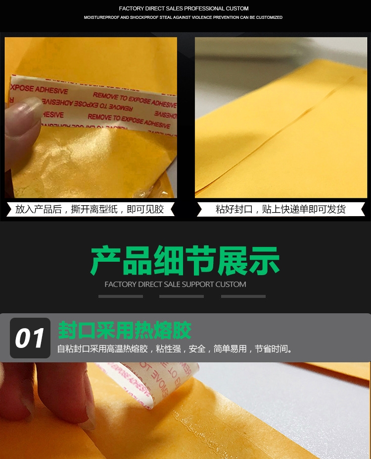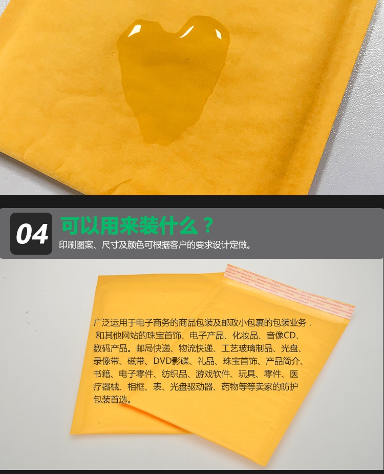 外层采用优质牛皮纸(用于填写地址、增加包装强度),内层使用弹性气泡膜(防湿、抗压、抗震),保护被邮寄物品的安全,防止物品在邮寄过程中因压、碰、跌落而损坏。产品具有防震、防压、防潮、重量轻、使用安全方便、适应性强等特点,是替代小木箱、小纸箱的理想新一代邮件包装品。