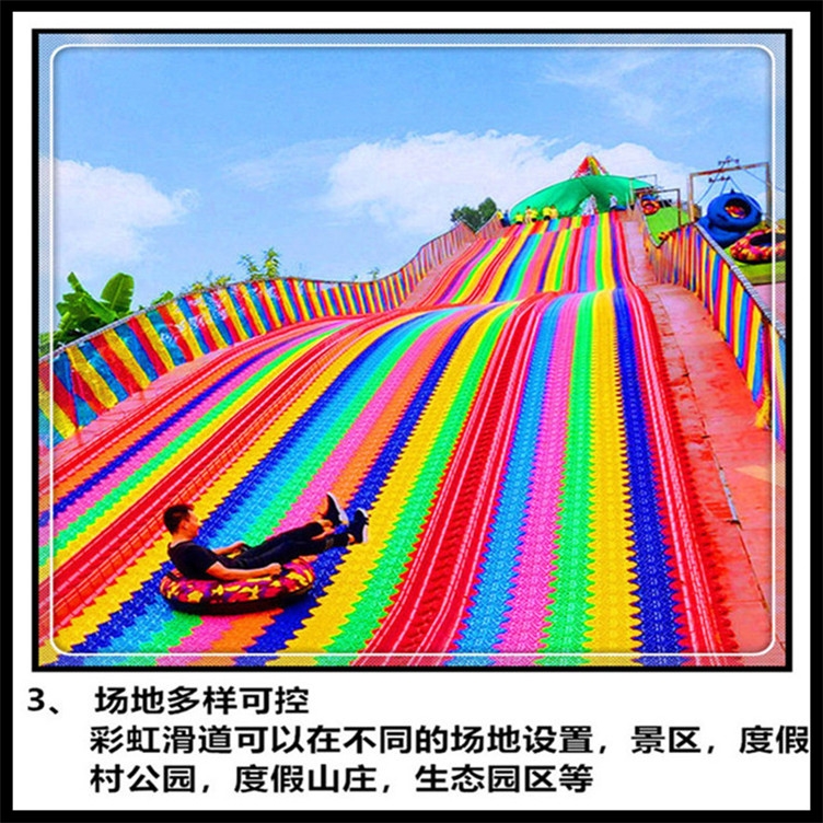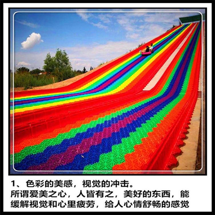 彩虹滑道是一种新型的拼块式旱地滑道。由挡板与滑板两部分组成单块滑板之间,滑板与挡板之间通过锁扣链接滑道宽度,长度均可因地制宜实现自由调节,滑板造型为四边形,六边形,线条优美颜色为七彩,搭配组合视觉冲击猛烈突破了季节、地域、场地的 彩旱滑项目具有诸多优势:它环保、低能、 、健康、新概念、受欢迎度等,均符合 发展方向。