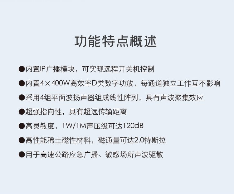 适合场景 | 高速公路路侧广播 龙门架定向广播 收费站广播 高速公路出入口广播 | ||