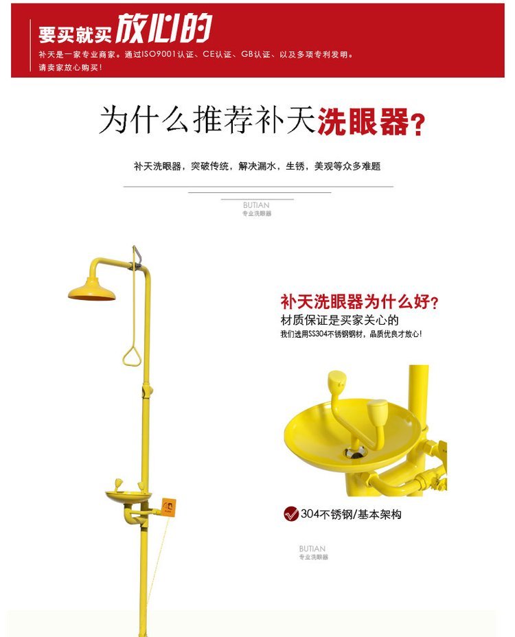 ●产品名称:双防复合式冲淋洗眼器●品牌:补天●型号:BTF12-A●生产标准:美国ANSIZ358.1-2014●设计压力0.8Mpa●工作压力:0.2—0.4Mpa●进水口尺寸:RC1-1/4,高度1520MM●排水口尺寸:RC1-1/4,高度90MM●冲淋喷头流量:120-180L/min●洗眼喷头流量:>12L/min●洗眼器总高度:2340MM●冲淋喷头高度:2150MM●洗眼喷头高度:1050MM●使用介质:符合卫生标准常温生活用水。