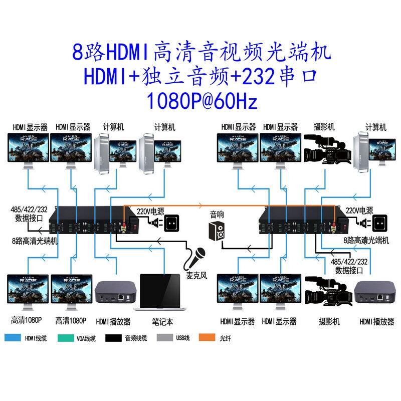通过一芯光纤可以传输:(8路单向HDMI音视频信号/4路双向音视频信号/6路正向2路反向音视频信号)
