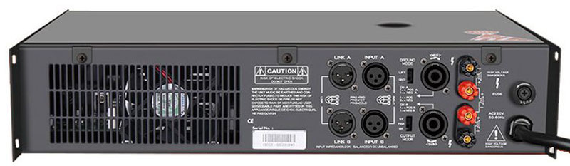 2个增益控制旋钮1个电源开关1个待机LED灯,2组8个灯分别对应声道处于工作、信号、削波、保护状态;