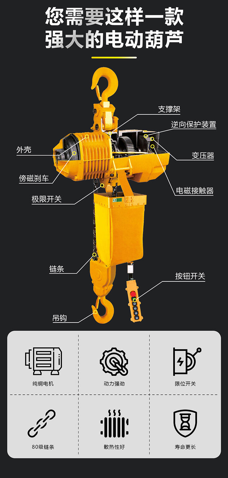 3.极 限开关:重物吊上吊下都有极 限开关装置,使电机自动停止,以避免链条超出;