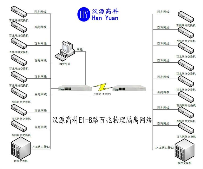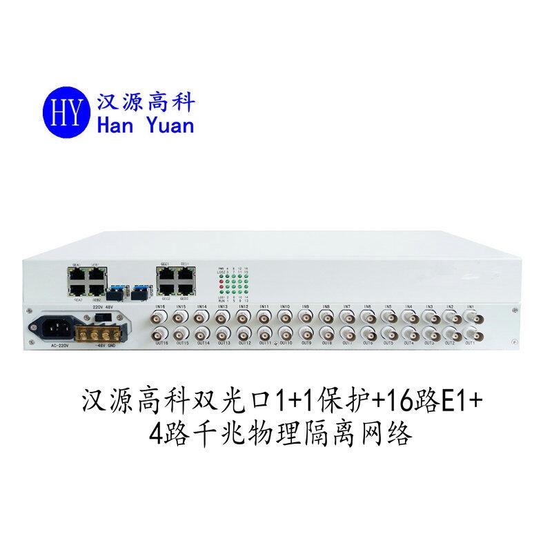 ?双光口1+1保护+16路E1+8路物理隔离百兆网络光端机HY-16E18FL-V是汉源高科(北京)科技有限公司采用自主知识产权的大规模集成电路,应用时分复用技术,将8路物理隔离的百兆以太网信号和16路E1信号混合编码后在一对光纤上传输。实现10/100以太网业务和E1业务混合传输。该机采用19英寸、1U机框设计,集成度高,体积小,功耗低,工作可靠,安装使用方便。